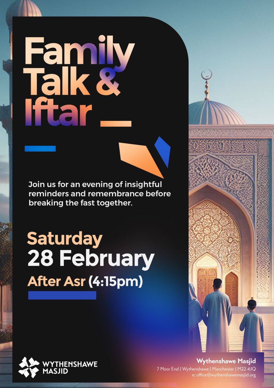 Wythenshawe Masjid Presents: Boys Youth Iftar 🗓️ Saturday 21st February ⏰ 4:30pm to 6:30pm (strict collection time) 👥 Brothers aged 12-18 Registration […]